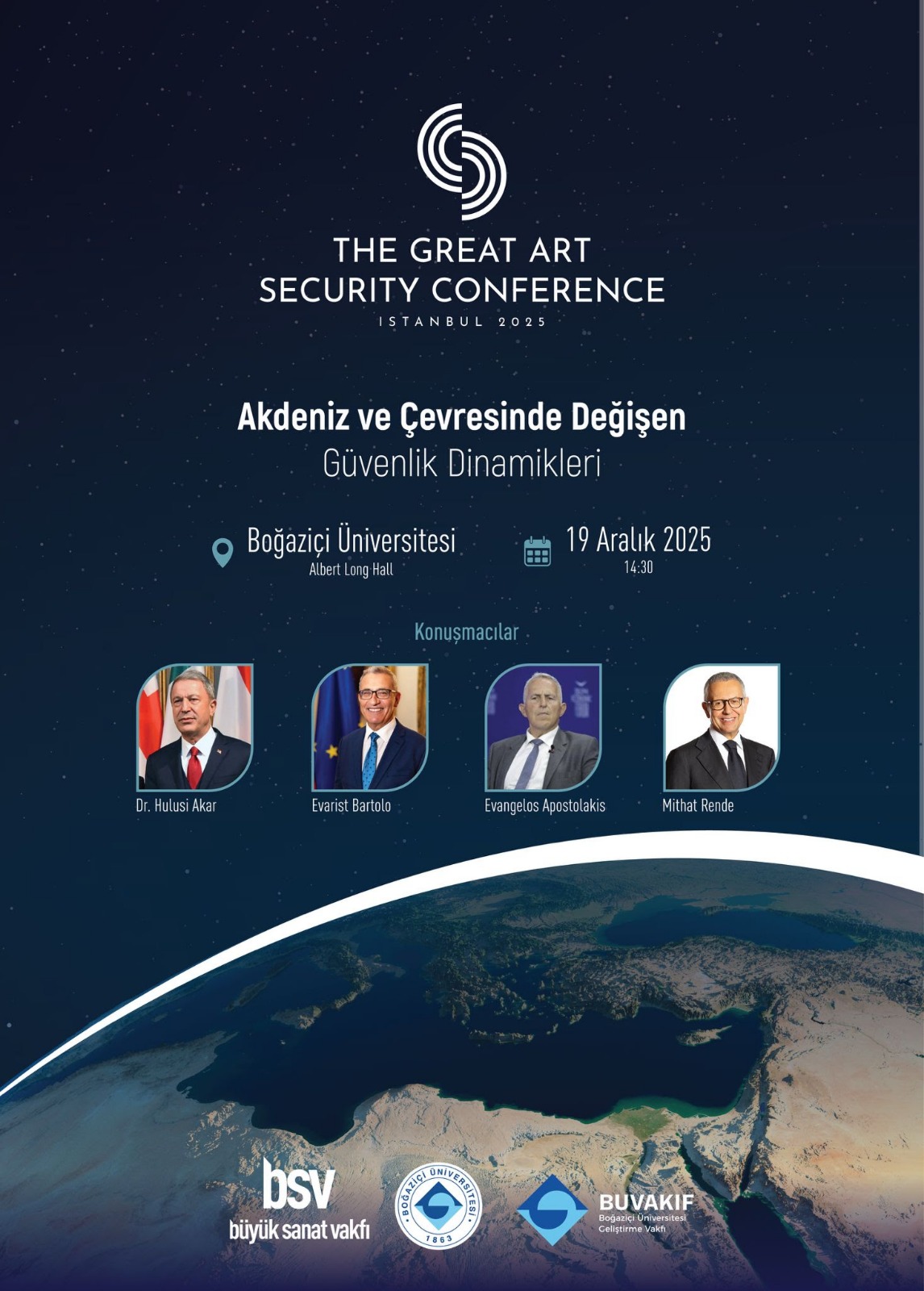 Açılış konuşmasını Boğaziçi Üniversitesi Rektörü Prof. Dr. Naci İnci’nin gerçekleştirdiği panelin moderatörlüğünü, Türkiye Cumhuriyeti eski Millî Savunma Bakanı ve hâlen Türkiye Büyük Millet Meclisi Millî Savunma Komisyonu Başkanı olan Dr. Hulusi Akar üstlenirken; Yunanistan’ın eski Savunma Bakanı Evangelos Apostolakis, Malta’nın eski Dışişleri Bakanı Evarist Bartolo ve Türkiye Cumhuriyeti’nin emekli büyükelçilerinden Mithat Rende konuşmacı olarak yer aldı.
